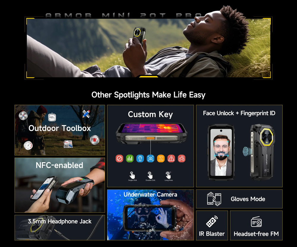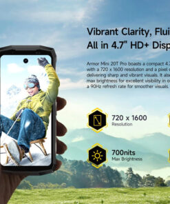 Το ULEFONE Armor Mini 20T Pro είναι ένα στιβαρό και αδιάβροχο smartphone με πιστοποίηση IP68/IP69K. Διαθέτει οθόνη 4.7″ HD+ με Corning Gorilla Glass Victus, οκταπύρηνο επεξεργαστή MediaTek Dimensity 6300, 8GB RAM (+8GB virtual) και 256GB αποθηκευτικό χώρο, επεκτάσιμο έως 2TB με micro SD.