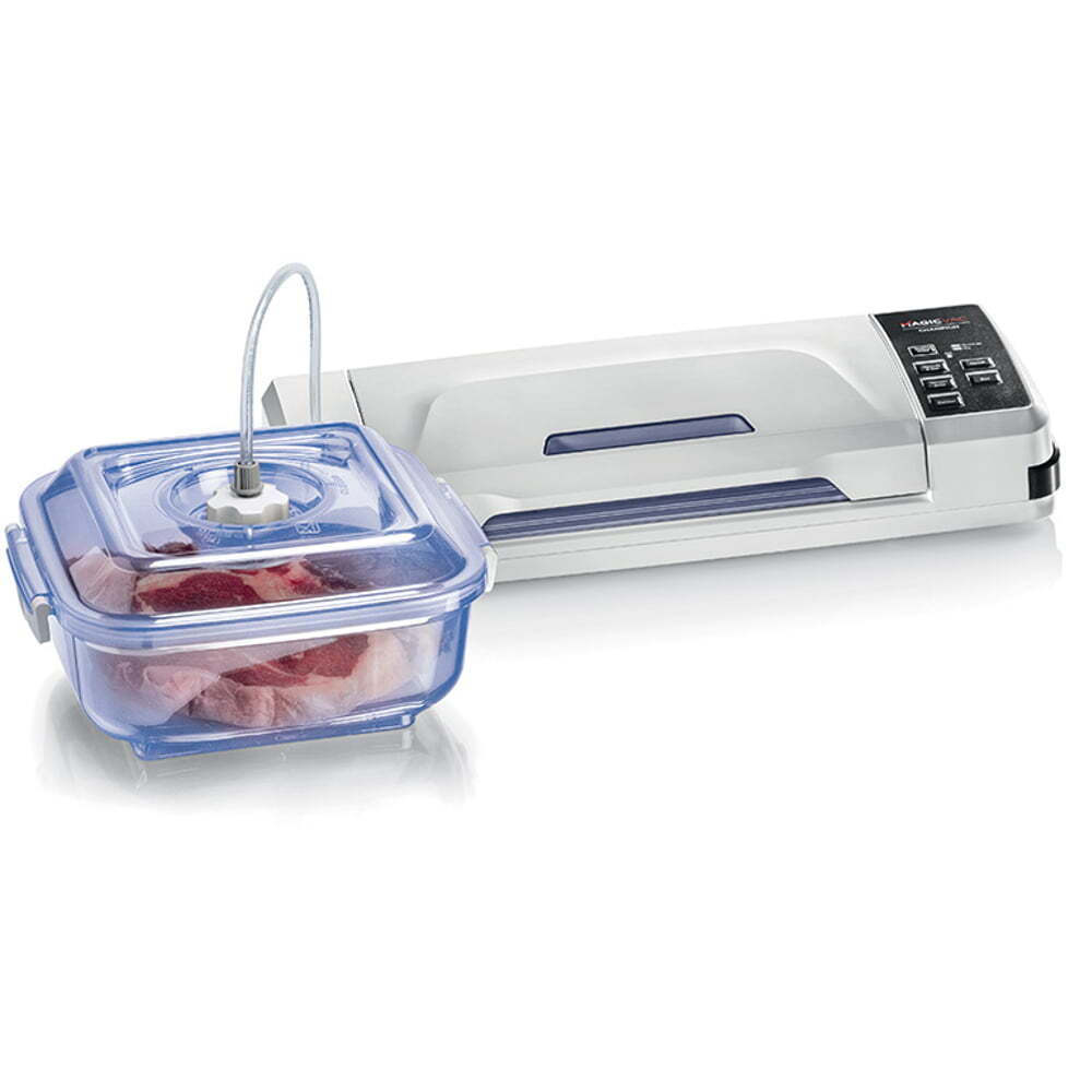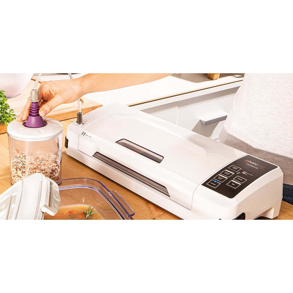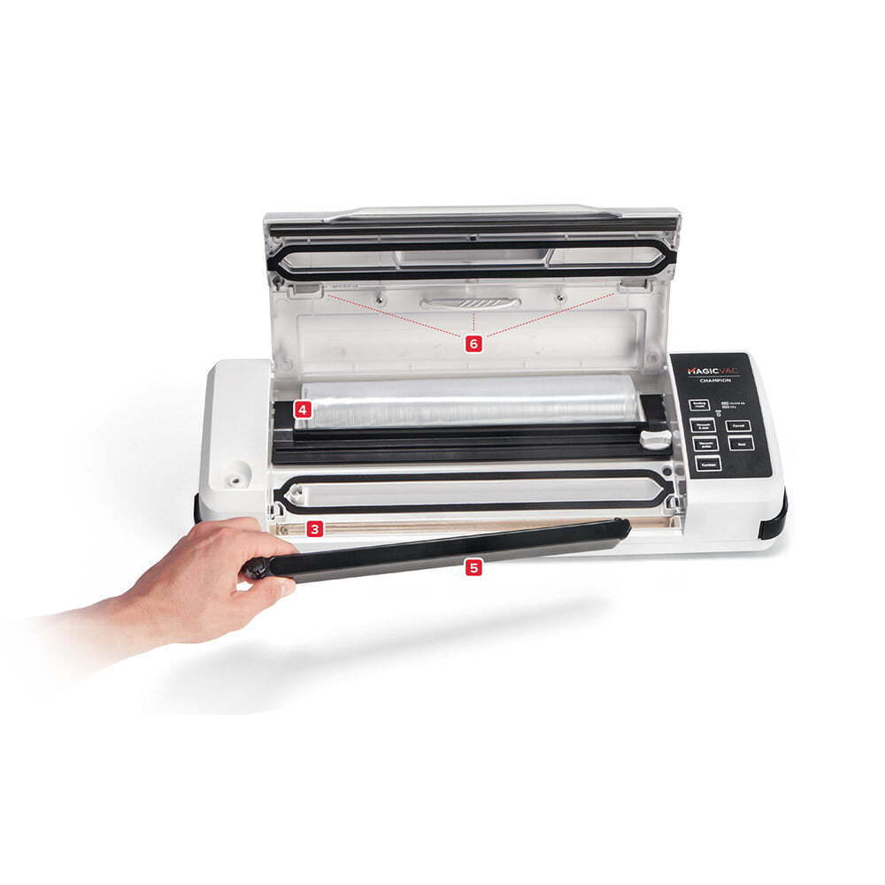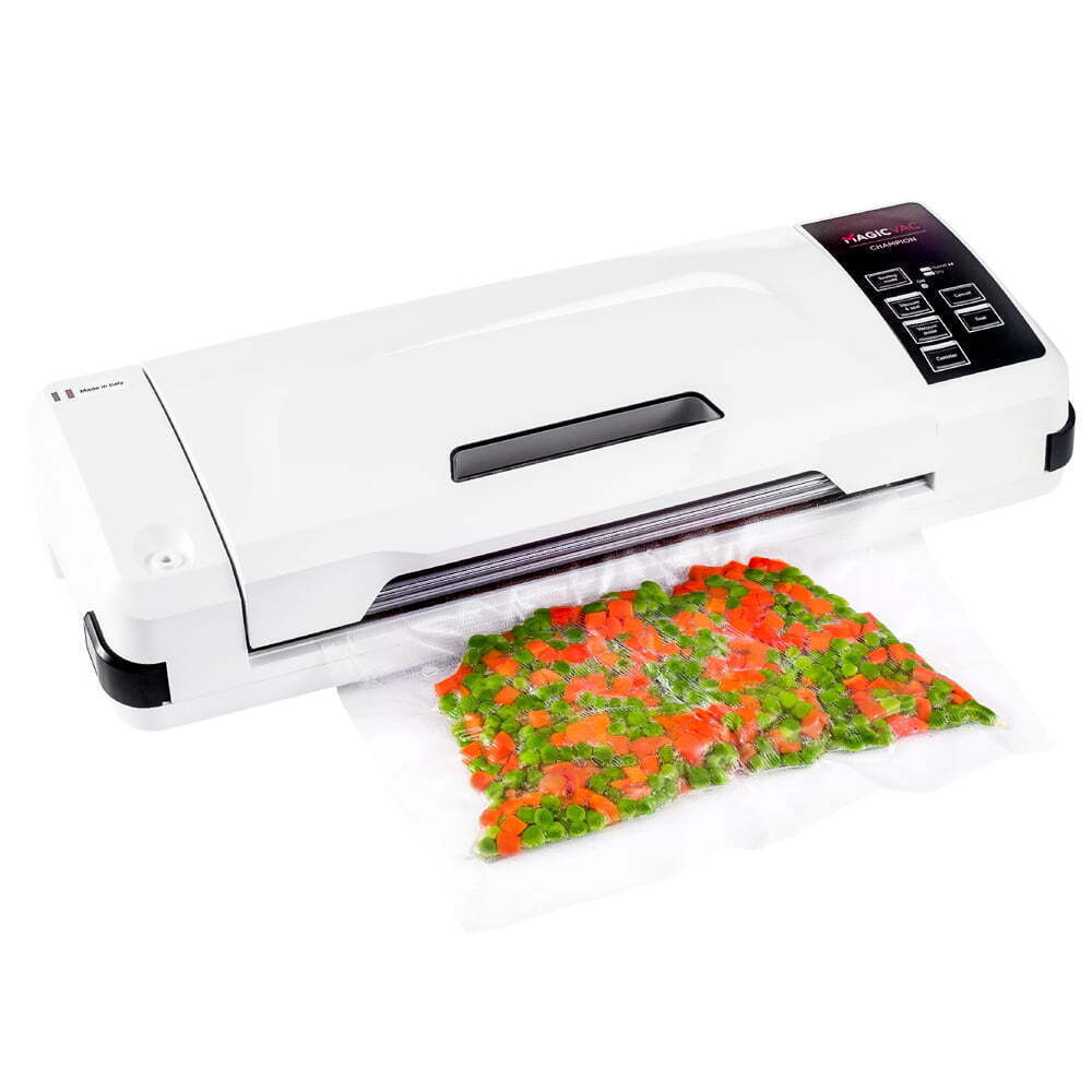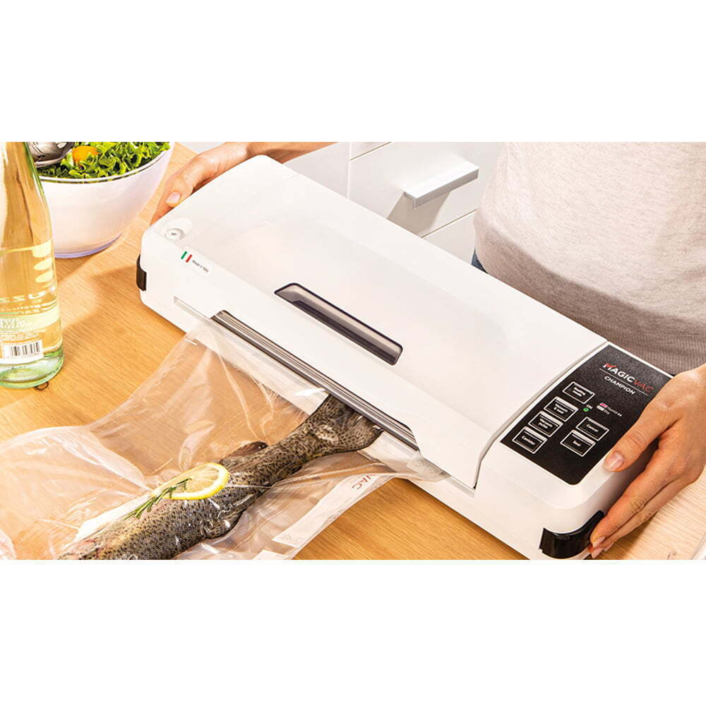 Η σφραγιστική συσκευή Champion από την Magic Vac διατηρεί τα τρόφιμα φρέσκα έως 5 φορές περισσότερο σε σύγκριση με τις παραδοσιακές μεθόδους συντήρησης, χάρη στην πατενταρισμένη τεχνολογία υψηλής ποιότητας. Διαθέτει πρακτικό παράθυρο που σας επιτρέπει να βλέπετε τις σακούλες και να τις τοποθετείτε σωστά στην μπάρα σφραγίσματος.
