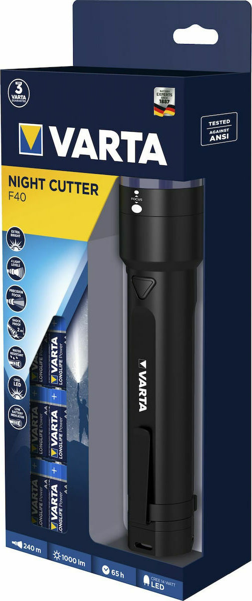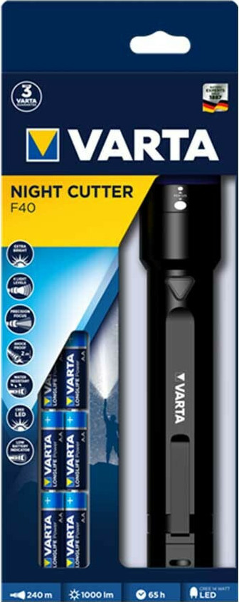 Οι φακοί της σειράς Varta Night Cutter συνδυάζουν απλό και κομψό σχεδιασμό με υψηλή φωτεινότητα. Διαθέτουν LED CREE με χαρακτηριστικά όπως εστίαση ακριβείας, οθόνη κατάστασης μπαταρίας και προστασία από πιτσιλίσματα, καθώς και 4 επίπεδα φωτισμού.