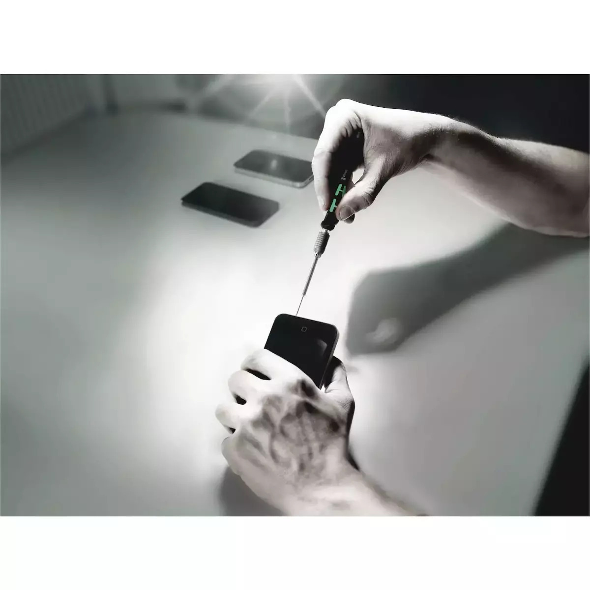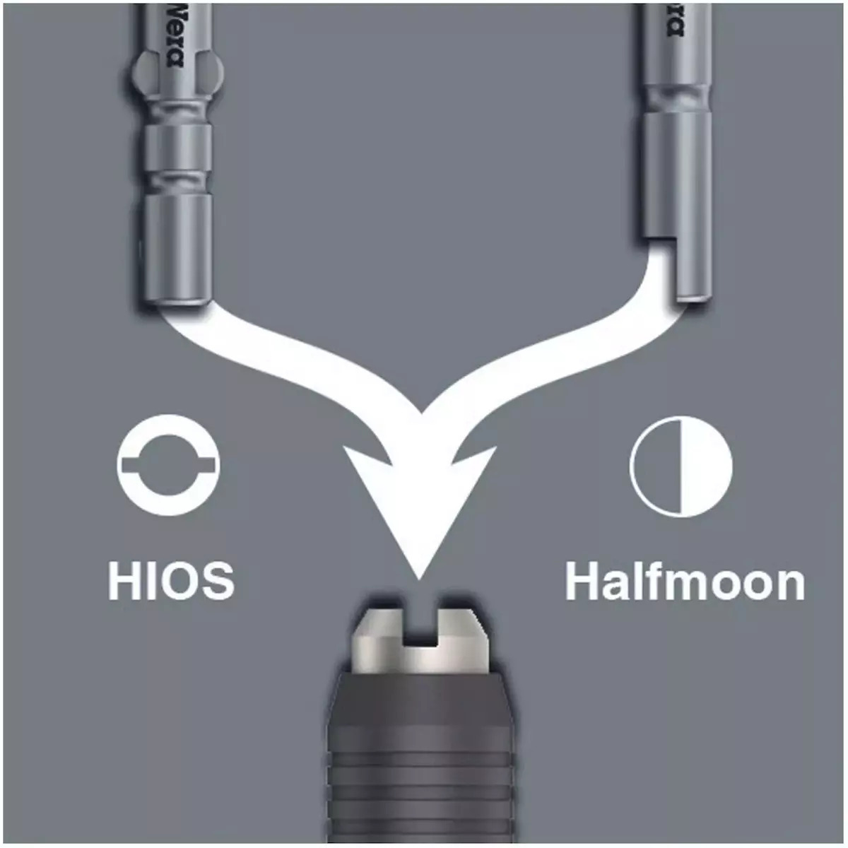 Σετ Kraftform Kompakt Micro 11 Universal για εργασίες ακριβείας. Περιλαμβάνει άκρες Halfmoon 4 mm (σειρά Wera 9) και HIOS 4 mm (σειρά Wera 21). Ένα σύστημα αντικαταστάσιμων άκρων και λαβών επιτρέπει τη γρήγορη αντικατάσταση των εργαλείων. Η λαβή Kraftform Micro διαθέτει περιστρεφόμενο καπάκι και ζώνη περιστροφής για γρήγορη περιστροφή του κατσαβιδιού. Η ζώνη μεταφοράς δύναμης έχει μαλακά ελαστικά ένθετα για μετάδοση υψηλών ροπών. Η ζώνη ακριβείας εξασφαλίζει τον έλεγχο της γωνίας περιστροφής του εργαλείου κατά την εργασία.