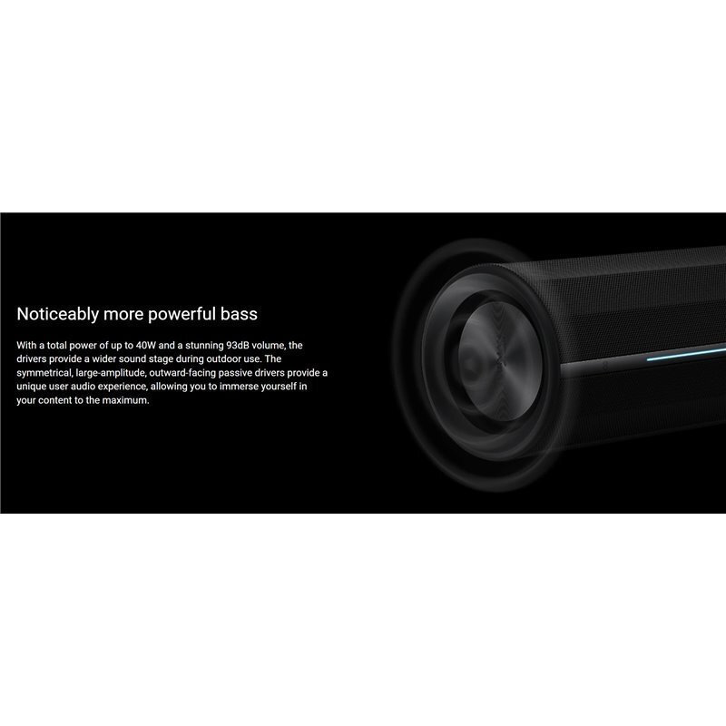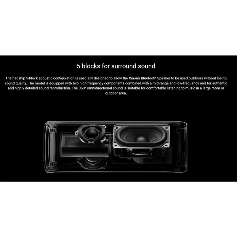Το φορητό bluetooth ηχείο της Xiaomi με ισχύ 40 watt, περιέχει εσωτερικά δύο full-range ηχεία για στερεοφωνικό ήχο και ένα subwoofer για πιο γεμάτο μπάσο. Mε μια πλήρη φόρτιση, σας προσφέρει έως 5 ώρες συνεχούς αναπαραγωγής μουσικής. Επιπλέον έχει την δυνατότητα φόρτισης μέσω usb, για να μπορείτε εύκολα να το φορτίσετε με powerbank. Με βαθμό προστασίας IP67, μπορείτε να πάρετε το ηχείο μαζί σας στη παραλία, την πισίνα ή το δάσος, καθώς έχει πλήρη προστασία από την σκόνη και αντέχει στο νερό για 30′, σε βάθος πάνω από 1 μέτρο. Προσοχή η κίνηση μέσα στο νερό δημιουργεί αυξημένη πίεση σαν να το έχουμε σε μεγαλύτερο βάθος.