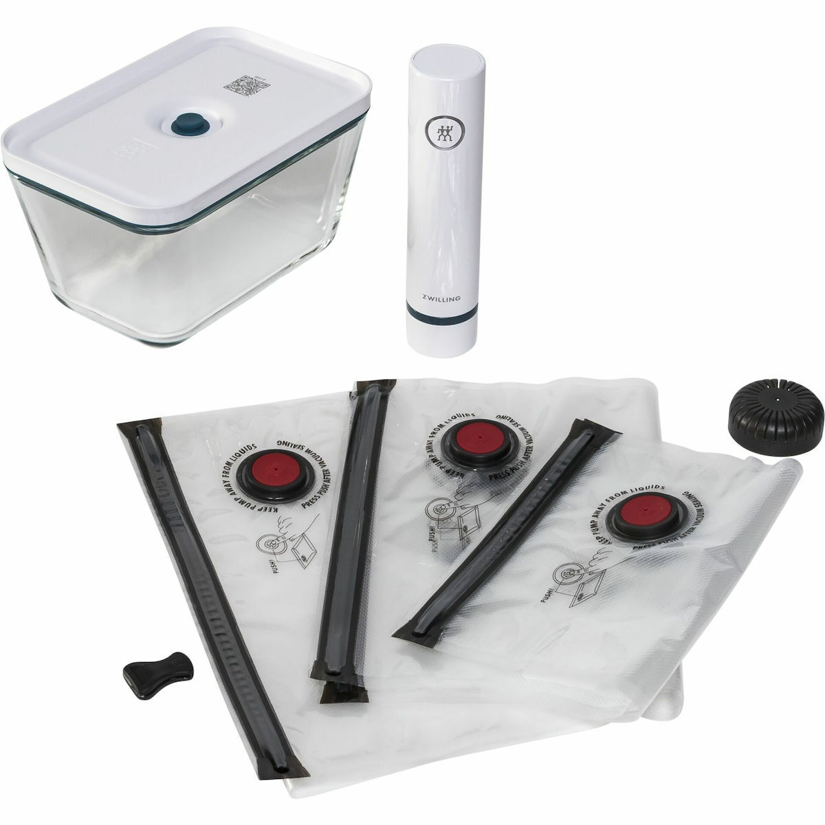 Σετ 7 τεμαχίων Zwilling Fresh & Save. Απλώς τοποθετήστε τη συσκευή στη βαλβίδα που βρίσκεται στο καπάκι του δοχείου ή της σακούλας και πατήστε το κουμπί. Η άντληση ολοκληρώνεται αυτόματα.