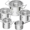 Σετ κατσαρόλες κατασκευασμένες από ανοξείδωτο ατσάλι. Είναι ανθεκτικές στο φούρνο έως 180°C και μπορούν να πλυθούν στο πλυντήριο πιάτων. Διαθέτουν καπάκια με κάλυμμα σιλικόνης, το οποίο είναι εξοπλισμένο με κόσκινο για την αποστράγγιση υγρών.